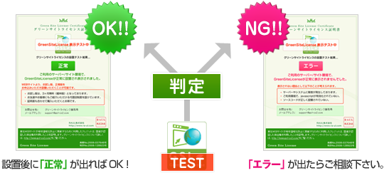 ①下のソースダウンロードに表示されているソースコードをコピーして、あなたのサイトのHTMLページに挿入して下さい。 ②あなたのサイトにGSLシールが表示されたら、まずシールの表示は問題ありません。 ③次にGSLシールをクリックして下さい。 ④下の図のように正常ページが表示されればあなたのサイトはGreenSiteLicenseを問題なく掲載することが出来ます。 エラーページが表示された場合は何らかの理由で、現在の状態ではGreenSiteLicenseは掲載出来ないことを表しております。 ⑤エラーページが表示された方は、以下の「クイック設置マニュアル」をダウンロードして掲載出来ない理由を確認して下さい。 |